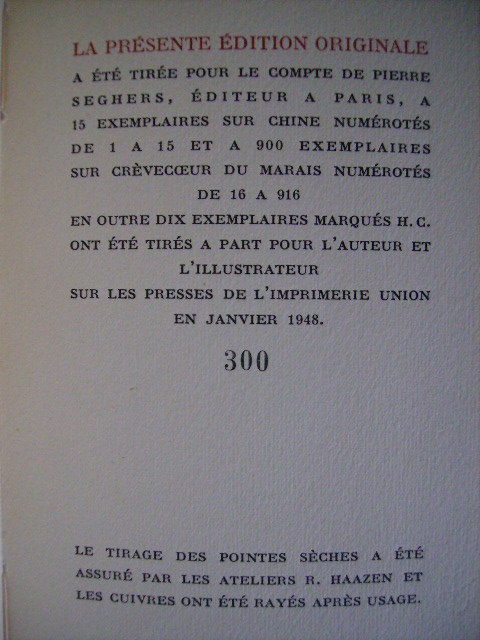 Seghers発行。限定915部。41p。サイン表記なし。テキスト 仏語。大変状態の良い美本です。